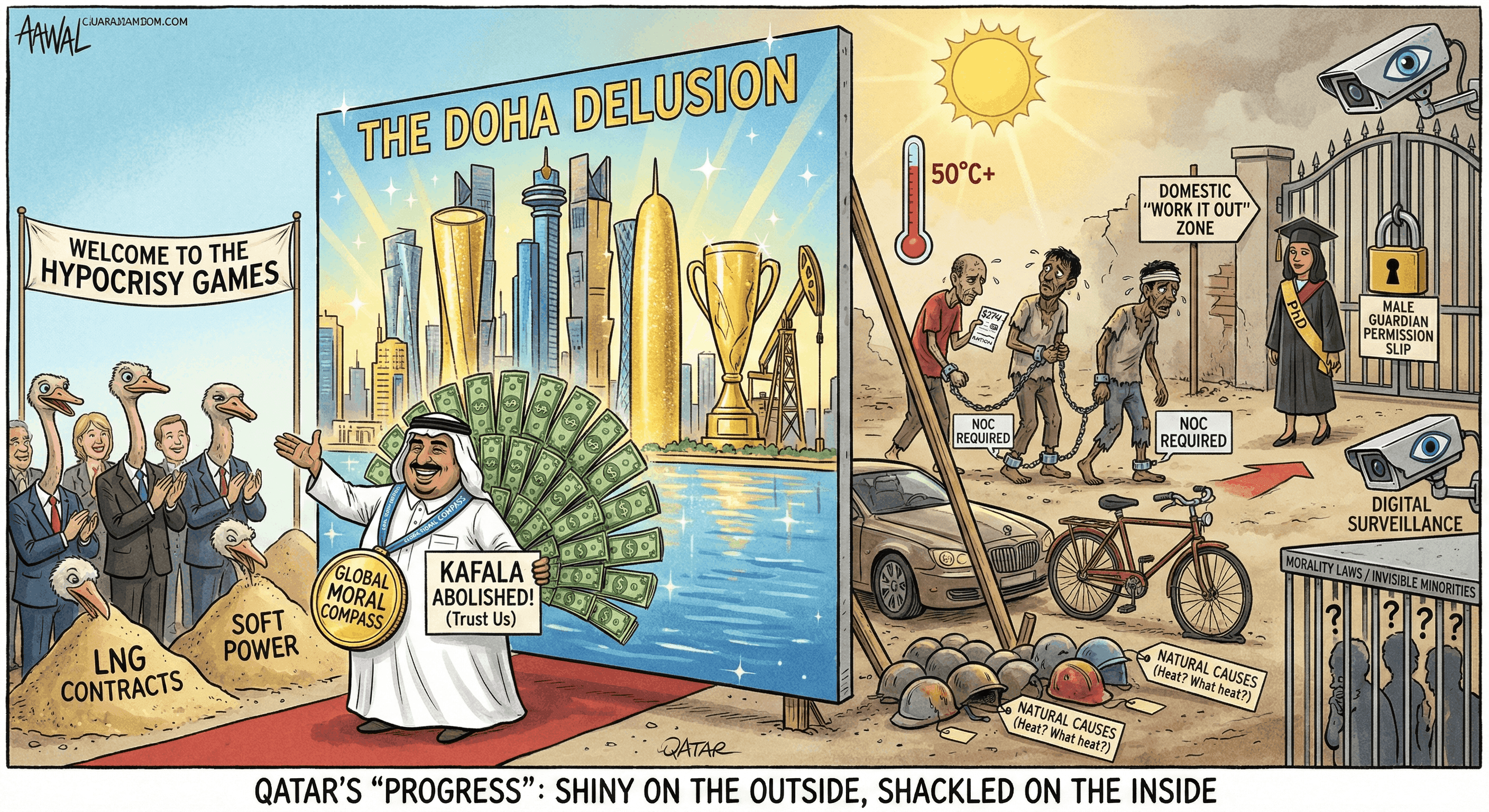 Qatar is a Potemkin Village built on gas reserves. It looks shiny from the outside, but if you lean too hard on the walls, you can hear the rattling of the chains. The delta between their international swagger and domestic drudgery is wider than the Gulf itself.