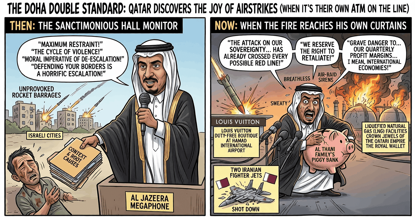 Not tomorrow. Not after a negotiated settlement in Geneva. Immediately. We at That’s Qatarted! are connoisseurs of hypocrisy. We study it, we document it, and we marvel at its boundless depths. But the absolute, unmitigated gall required for the State of Qatar to suddenly play the role of the frantic peacemaker—only after their own regional ATM is threatened—is a masterpiece that belongs in the Louvre of gaslighting. Let us take a deep, comprehensive dive into the anatomy of this spectacular double standard.